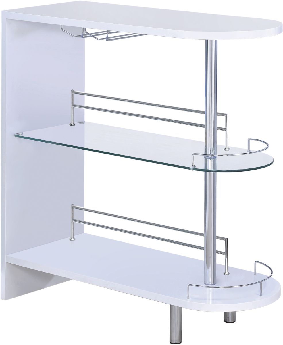 Liven up your next gathering with this attractive, contemporary bar unit. With a sleek design and a smooth, glossy white finish, it has a modern and glamorous look. Two tempered glass shelves provide lots of space for storage, while a built-in stemware rack adds extra convenience.Read More