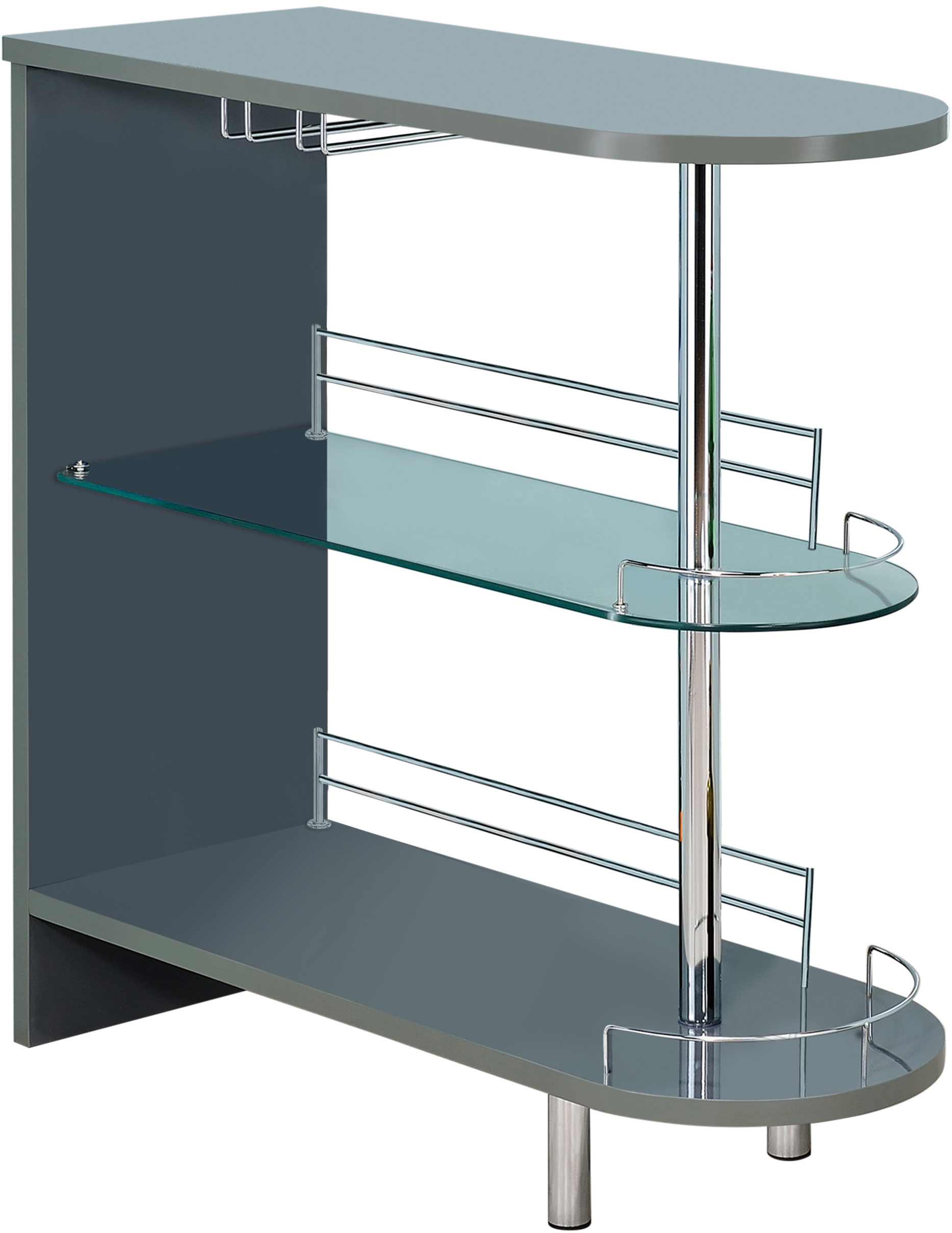 Add a fun retro feel to a modern living area with this contemporary bar table. In a glossy grey finish, the silhouette is cool and neutral. Tempered glass storage shelves offer a clean and open feel while displaying libation bottles in style.Read More