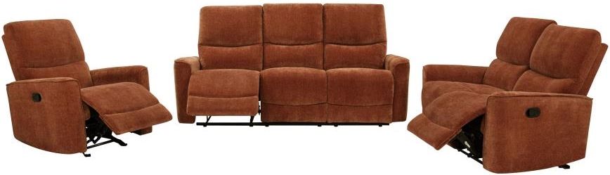 Includes: One (1) reclining sofa, one (1) reclining loveseat, and one (1) glider recliner