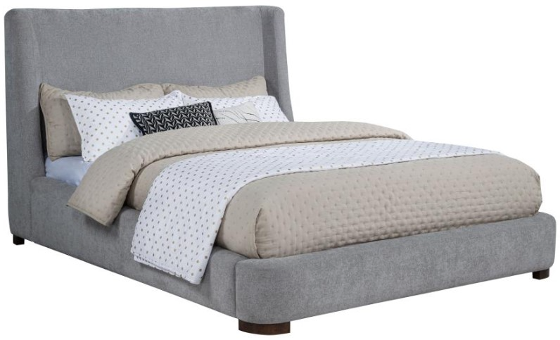 Eastern king platform bed with graceful wingback headboard and wide profile