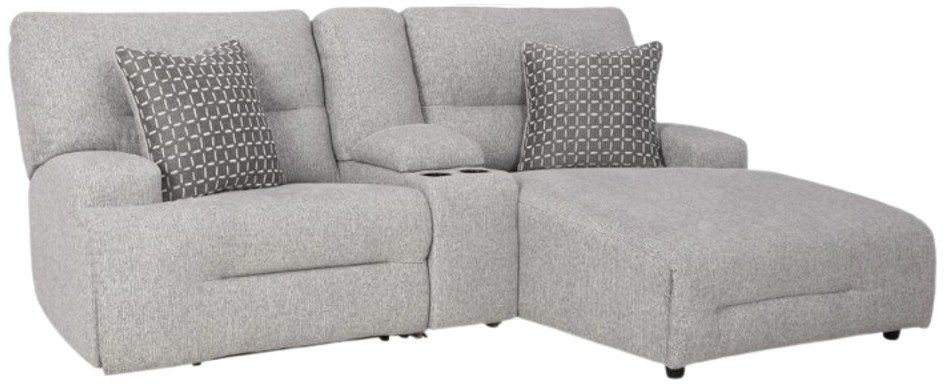 Includes left-arm facing power recliner, console with storage and right-arm facing power reclining back chaise