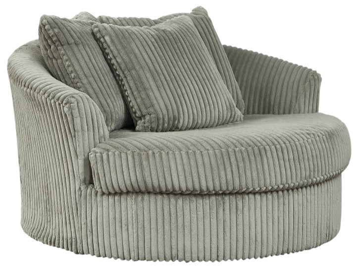 Plush and posh. Showcase your eye for on-trend texture with the statement-making cord upholstery of this oversized swivel accent chair. Its stunningly soft fabric entices in a warm neutral hue, complementing contemporary color palettes. Sink into the spacious cushion, this cozy living room chair highlights your high-end approach to comfort and style.Read More